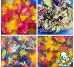 Ну е мое, ну шож так поздно рецепт ко мне попал? Вот только из парника последние томаты удалила, а были они у меня всех существующих цветов - и черные, и жёлтые, и белые , и оранжевые, не говоря уже о красных и розовых. И базиличок рос фиолетовый ..