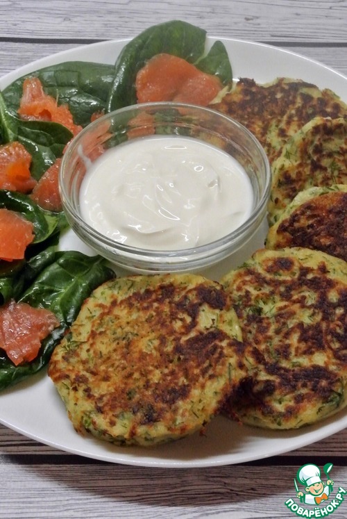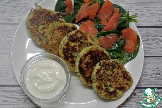 На тарелку к драниками выложить листья шпината, рукколы и зеленого салата. Посолить, поперчить, сбрызнуть оливковым маслом. Выложить ломтики малосольной форели. Подать сметану, вдруг кому-то не понравится есть с форелью.