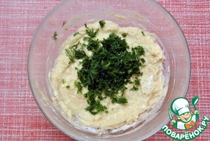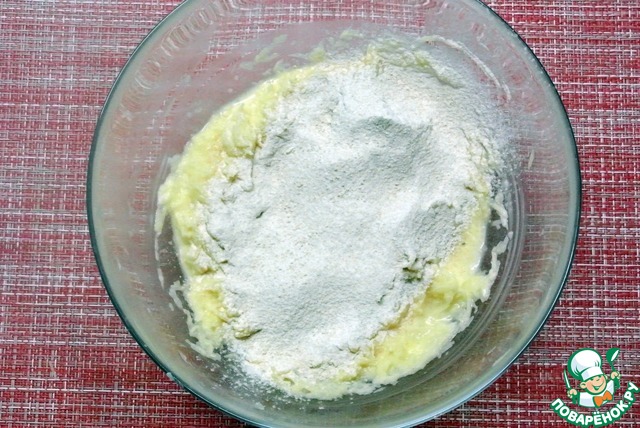 Вбить яйцо. Добавить творожный сыр. Всыпать просеянную муку. Перемешать.