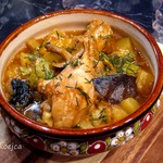 2. В сотейнике с толстым дном или глубокой сковороде обжариваем на растительном масле куриную голень, слегка, со всех сторон. Добовляем лук и морковь и продолжаем обжаривать около 5 минут. Далее добавляем томатный сок и даем закипеть. Затем добавляем заранее нарезанные овощи-картофель, кабачки, грибы. Сверху посыпаем приправами, солим, перемешиваем и наливаем стакан воды. Тушим под крышкой около 35 -40 минут. В конце посыпаем зеленью.