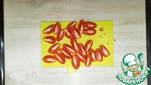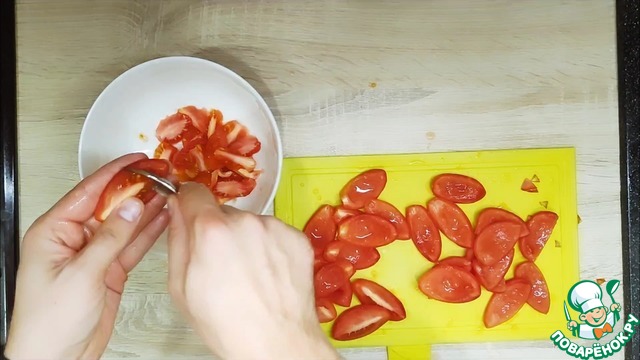 Помидоры разрезаем пополам, удаляем места крепления плодоножки, далее режем на четвертинки.