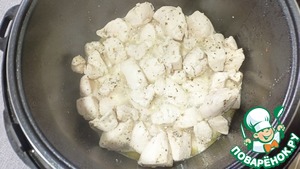 Отправляем в чашу масло, курицу и специи — Режим «Жарка» 15 минут (Не забываем перемешивать каждые 2-3 минуты).