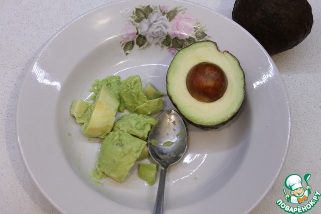 Тем временем сделаем закуску. Авокадо должно быть спелым, его нужно достать из кожуры, сбрызнуть лимонным соком и размять вилкой.