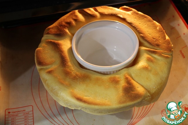 На застеленный противень по центру поставить формочку для запекания, которая послужит для формирования верха шляпы. Смазать её немного сверху маслом (я забыла, и у меня дно прилипло). Аккуратно накрыть её раскатанным тестом и, используя кольцо для выпечки, сформировать бортики. Отправить в разогретую духовку на 15-20 минут.
