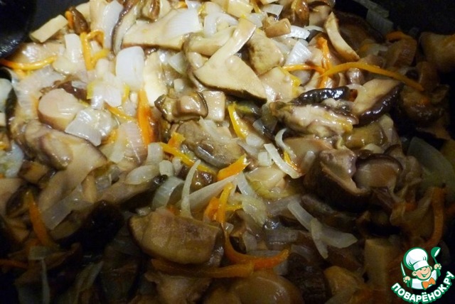 - Грибы (белые грибы, нарезанные и сваренные) — 1 кг