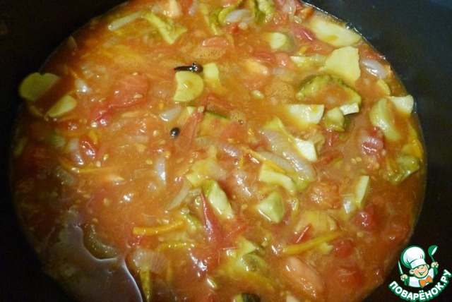 Помидоры нарезать крупными кусочками. Добавить их к грибам и тушить ещё минут 20. Добавить перец чили (если любите), гвоздику, лавр и душистый перец. Помидоры дадут много сока, так что вода не добавляется.