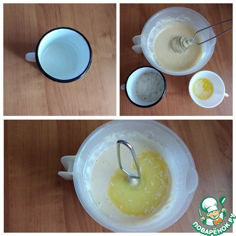 Делаем тесто. Посуду нужно взять высокую. Тесто будет подниматься. Я тесто буду делать на ночь. Сначала делаем опару. В 50 мл тёплого молока положила дрожжи 1 ч л и сахар 1 ч л. Размешала. Дождалась пенки (шапочки), дрожжи начали работать. В посуду с тёплым молоком 150 мл разбила 2 яйца категории С 0, добавила сахар и венчиком перемешала. Просеяла муку, посолила и перемешала. Вылила опару, опять всё перемешала и добавила растопленное сливочное масло. Всё соединила. Накрыла тесто. Подогрела духовку до т-30 С и поставила туда. Через часа 1,5 я тесто перемешала и оставила до утра в духовке (больше её не грела). Тесто с быстродействующими дрожжами можно выпекать блинами часа через 1,5-2.