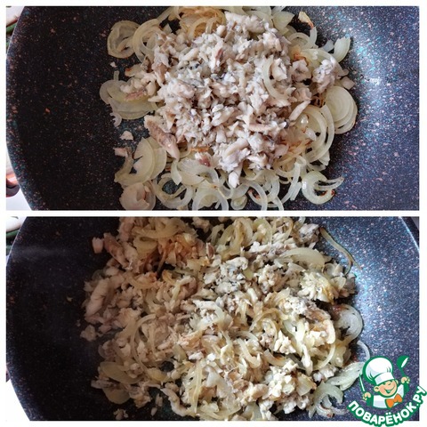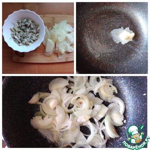 Начинку я сделаю из отварного хека и репчатого лука. На сковороде растопила масло сливочное, выложила порезанный лук. Позолотила до мягкости.