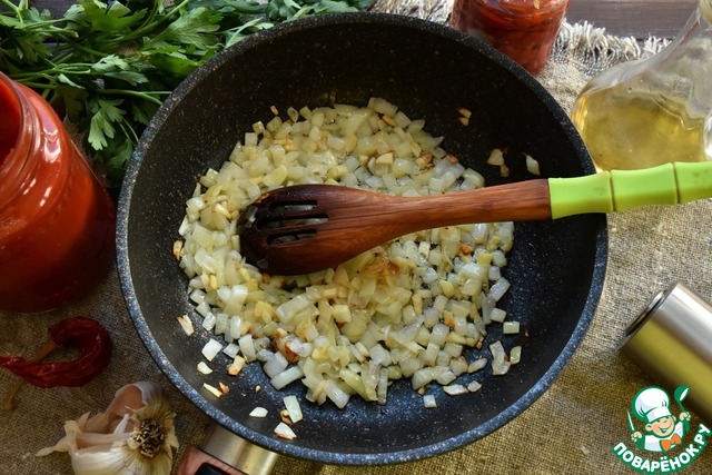 В сковороду вливаю оливковое масло и перекладываю нарезанные лук с чесноком. Обжариваю на среднем огне.