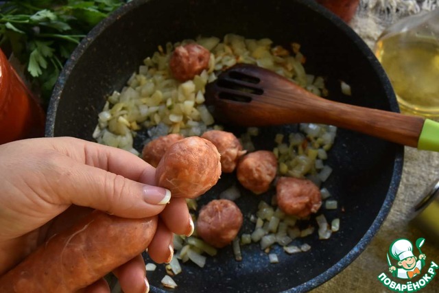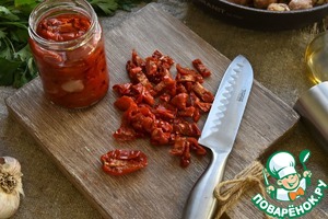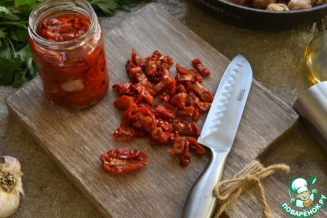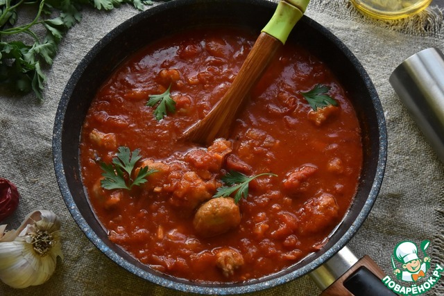 Добавляю в сковороду к мясным шарикам с луком нарезанные вяленые томаты и измельченные томаты в собственном соку. Добавляю по вкусу соль, сахар, специи и красный острый перец. Тушу соус на медленном огне до загущения.