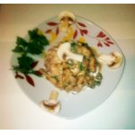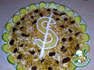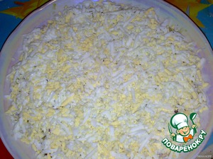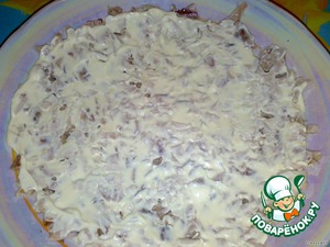 Нарезаем кусочками и укладываем на блюдо + майонез. -