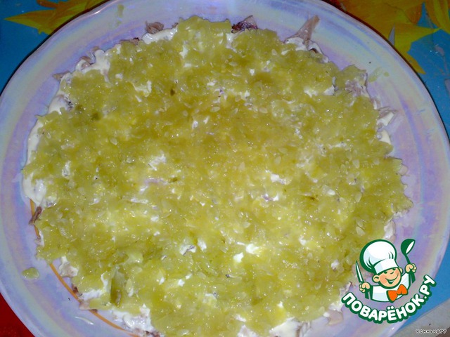 Маринованные огурцы очищаем от кожицы и натираем на крупной терке. Хорошо отжимаем от лишней жидкости и укладываем на мясо,