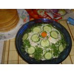 Карбонад нарезаем соломкой и кладем на огурцы + майонез.