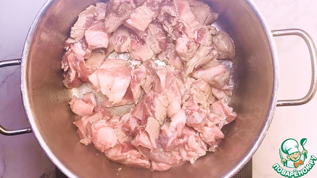 Первым делом свинину нарезаем небольшими кусочками и обжариваем до образования румяной корочки.