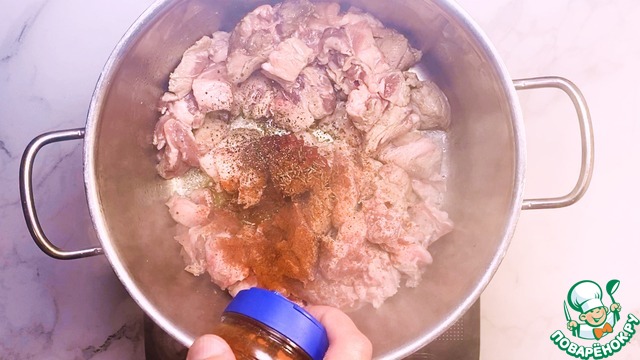 Затем к обжаренной свинине добавляем томатную пасту, тмин, черный перец, паприку.