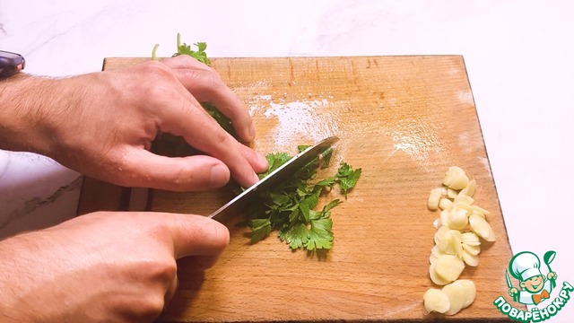 Пока все варится чеснок нарезаем тонкими слайсами.