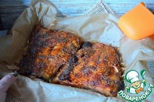 Смешать мёд, горчицу, смесь перцев и оливковое масло. Тщательно обмазать этой смесью куски рыбы. Вместо мёда я использую мелассу.