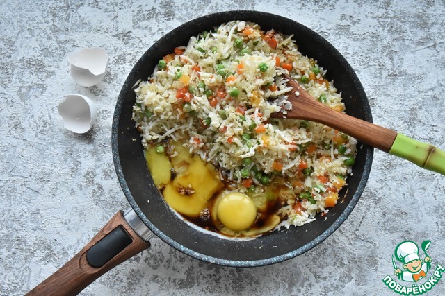 Сдвигаю обжаренные овощи в одну сторону и вбиваю пару яиц. Когда яйца начнут схватываться вливаю соевый соус и перемешиваю с овощной смсью.