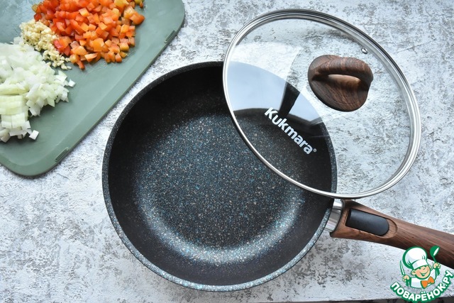 Для приготовления блюда использую сковороду "Granit ultra" бренда Kukmara. Покрытие, а это мелкая гранитная крошка, позволяет равномерно разогреть сковородку. Блюдо готовится равномерно и не пригорает.