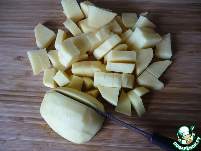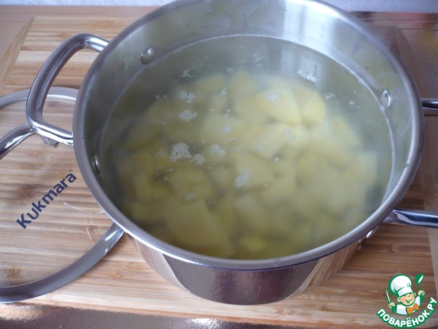 В кастрюлю налейте 2,3 литра воды и поставьте на огонь, воду немного подсолите и доведите до кипения. В кипящую воду положите нарезанный картофель и добавьте две горошины черного перца. Варите до готовности картофеля.