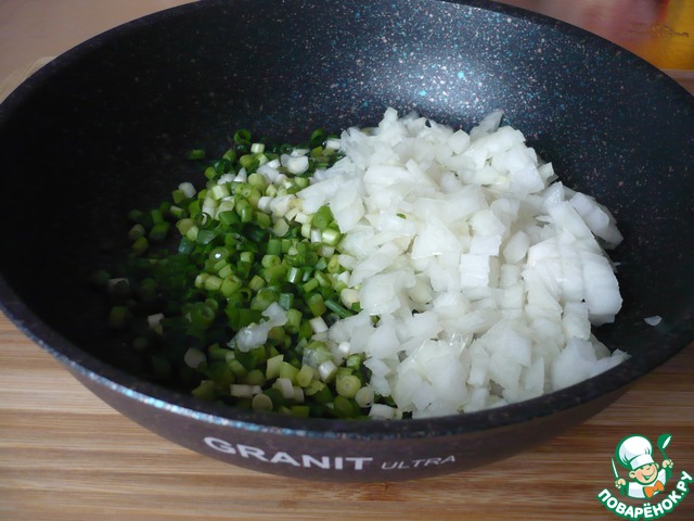 В сковороду ТМ Kukmara Granit Ultra налейте растительное масло, добавьте мелко нарезанный зеленый и репчатый лук.