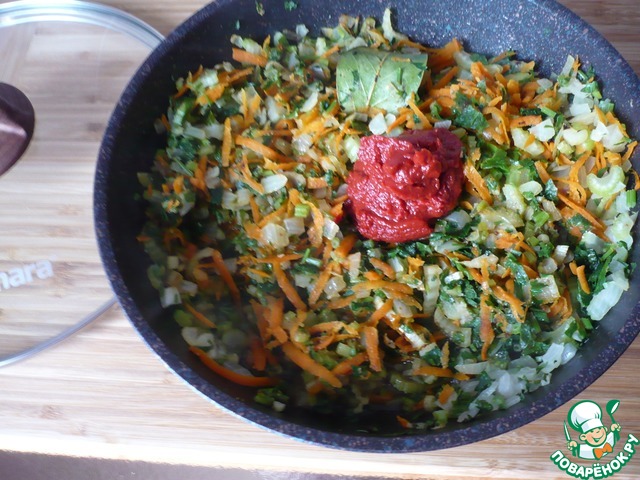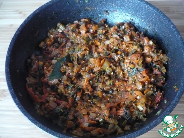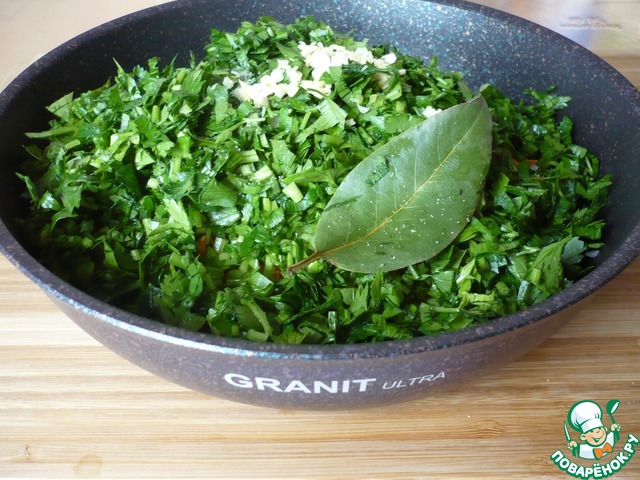 Петрушку мелко нарежьте и измельчите чеснок, и тоже добавьте к овощам в сковороду. Также положите в овощи лавровый лист. Теперь сковороду с овощами накройте крышкой и поставьте тушится на средний огонь.