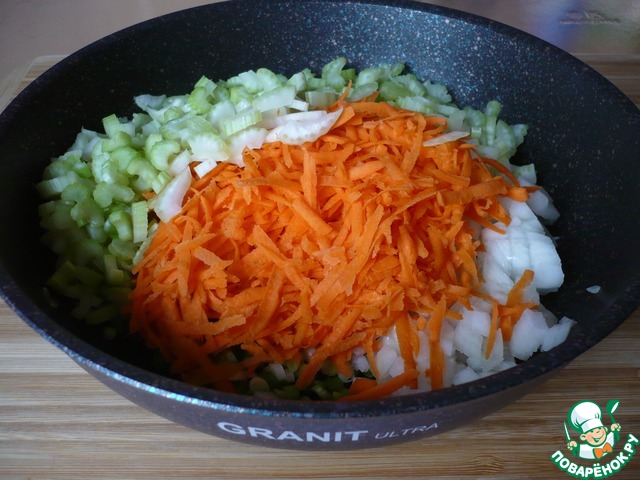 Мелко нарежьте стебли сельдерея и натрите на крупной терке морковь. Добавьте овощи к нарезанному луку.