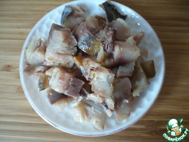 Теперь нужно будет разделать копченую скумбрию, которую необходимо очистить от кожи и костей, а затем нарезать на мелкие кусочки.