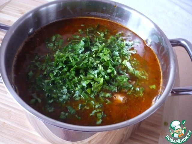 Затем в суп добавьте приготовленные кусочки копченой скумбрии и следом добавьте зелень. Все немного проварите на медленном огне 3-4 минуты. Налейте в суп ~ 200 мл кипящей воды (это сознательное действие, а не ошибка) и дайте супу еще прокипеть 15-20 минут.