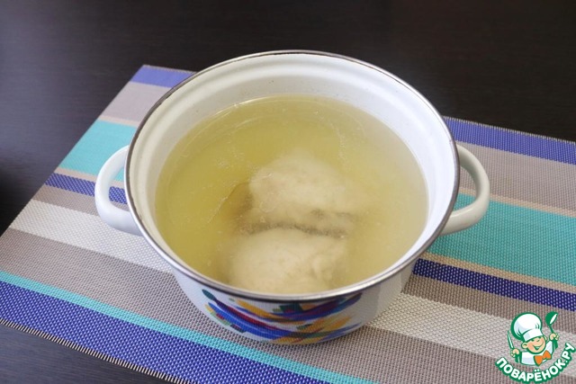 Тут примерный расход продуктов на две порции. Сварить куриный бульон. У меня два бедра, можно взять куриную грудку.