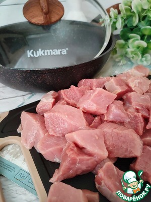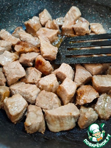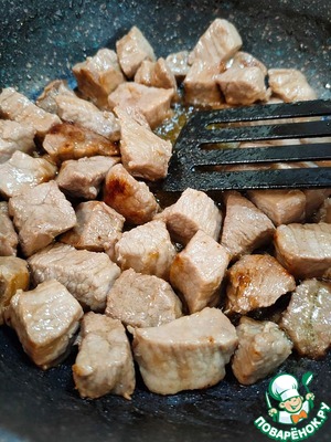 В сковороду ТМ "Kukmara"налейте оливковое масло. Поставьте на огонь. Выложите в сковороду мясо. Обжаривайте мясо на сильном огне до румяной корочки. Переложите мясо в тарелку.
