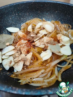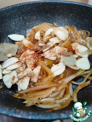Добавьте чеснок и все специи. Если есть шафран, добавьте несколько волосков, это придаст блюду особый восточный колорит. Готовьте ещё 1 минуту.