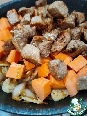 В сковороду верните обжаренное мясо и батат. Всё хорошо перемешайте.