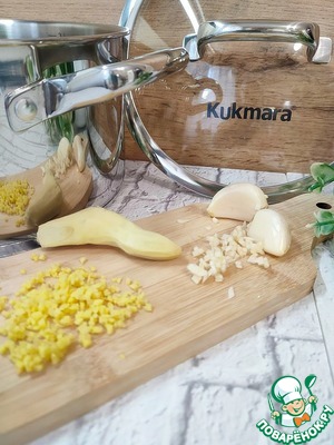 Очистите корень имбиря и зубчики чеснока. Мелко порубите.