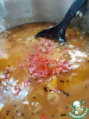 Остывшие семена пересыпьте в ступку, добавьте красный жгучий перец, и всё вместе хорошо перетрите.