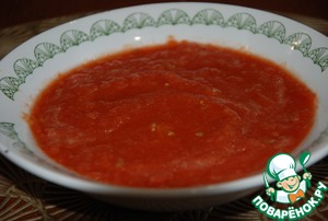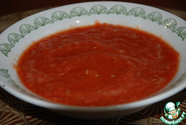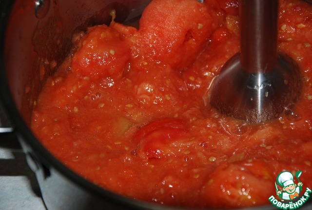 Очищенные помидорки, сложить в кастрюлю, пробить блендером до состояния пюре и поставить на огонь. При закипании добавить соль и кипятить еще 3 минутки