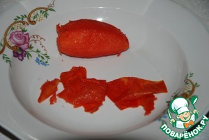 Доведете до кипения воду в кастрюле. Опустите в кипящую воду мытые помидоры на 1 минутку. Выловите их, остудите и снимите с них кожицу. Кожица слазит очень легко.