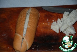 Булочку для хот-догов разрежьте пополам не до конца, вытащите мякиш.