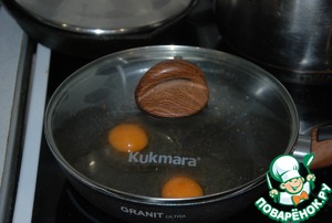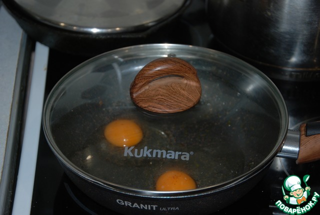 В это время поджарим яица, стараясь не разбить желток. Посылите их и присыпьте перчиком желток.