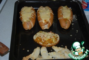 Начиняете начинкой булочки. Выкладываете начинку на батон. (Если батон смазать тонким слоем сливочного масла и выложить на противень смазанной стороной, получится очень хрустяще). Посыпаем натертым сыром и отправляем на противешке в духовку, разогретую до 200 гр. на 15 минут.