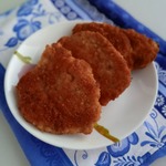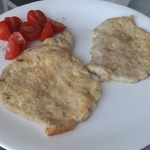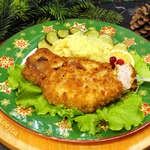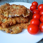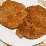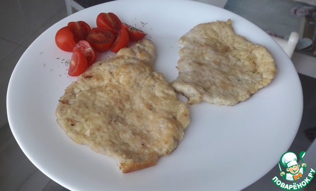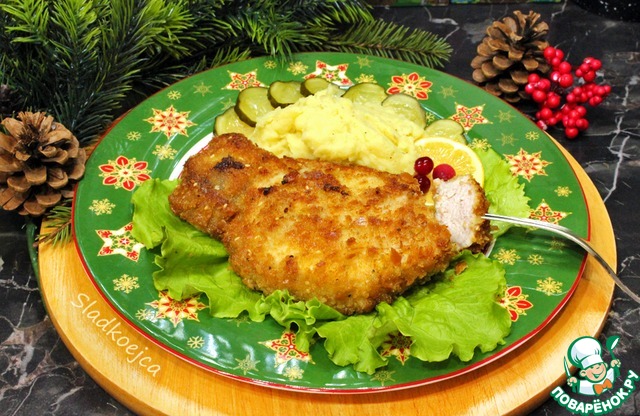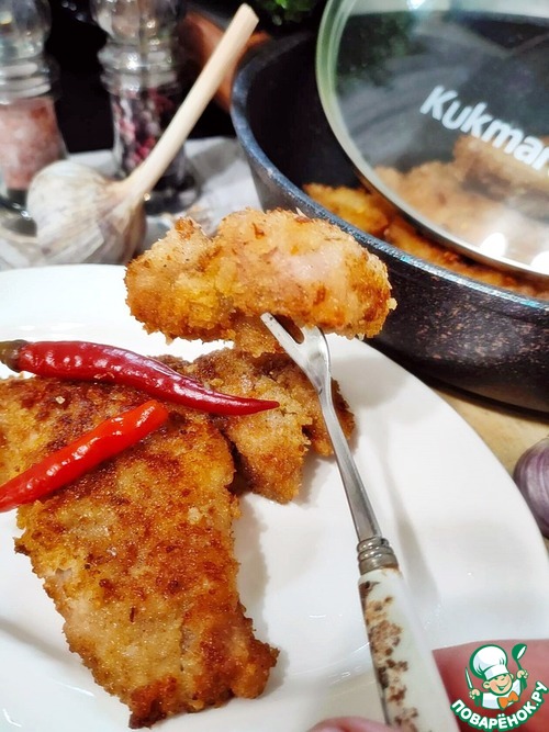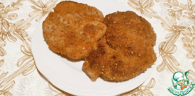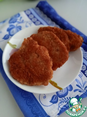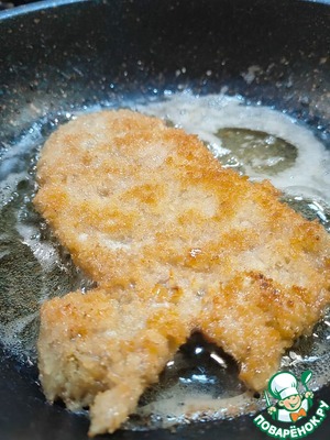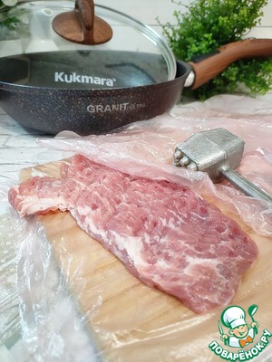 Мясо помойте под холодной водой. Просушите воду бумажным полотенцем. Нарежьте на стейки толщиной, примерно 1,5 см. Разделочную доску поместите в пищевой полиэтиленовый мешок. На доску положите один или два куска свинины. Для сохранения структуры волокон мяса, накройте куски сверху пищевой плёнкой или ещё одним мешком. Кухонным молоточком хорошо отбейте мясо с двух сторон. Ломтики должны быть тонкими. Поступите аналогично со всеми кусочками.