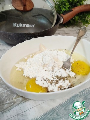 В глубокой миске соедините яйца, майонез, крахмал (у меня кукурузный), чёрный перец и все специи (кумин, розмарин, луковый порошок). Хорошо всё перемешайте.