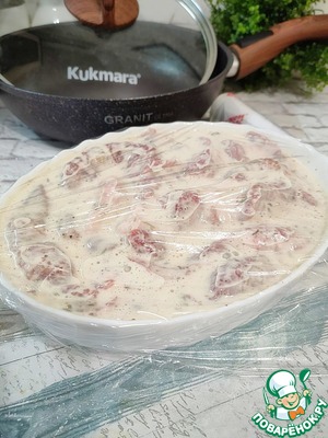 Накройте миску с мясом пищевой плёнкой и отправьте мариноваться в холодильник, минимум на 5 часов. За это время отбивные впитают в себя маринад, что сделает их очень нежными.