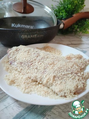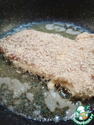 Обваляйте мясо в панировочных сухарях, смешанных с солью.