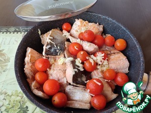 Всю обжаренную рыбу сложить обратно в сковороду, добавить натертый чеснок и помидоры.
