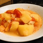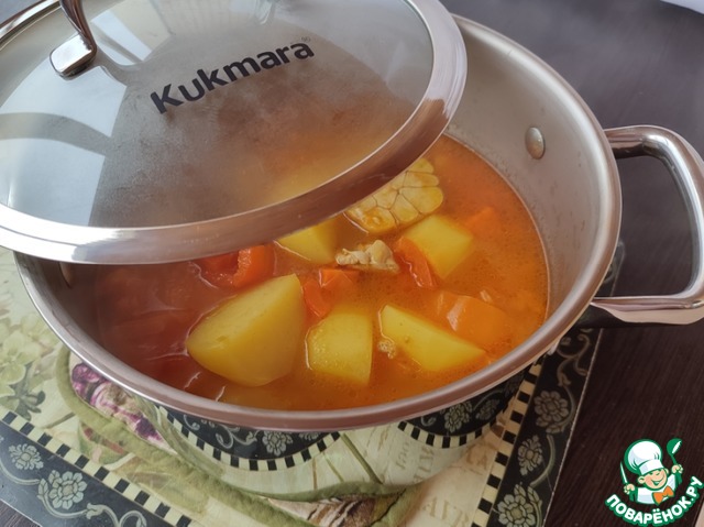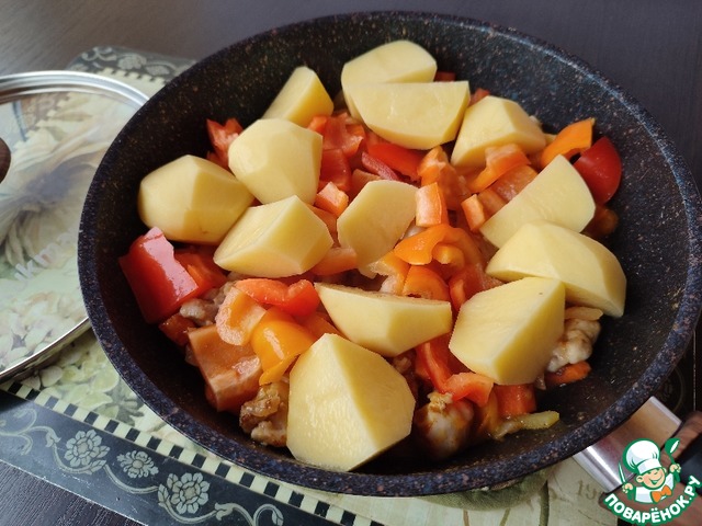 Добавить перец, нарезанный крупными брусочками и картофель (крупный делим на четыре части). Добавляем специи и соль. Прогреваем на сильном огне.