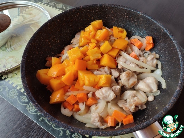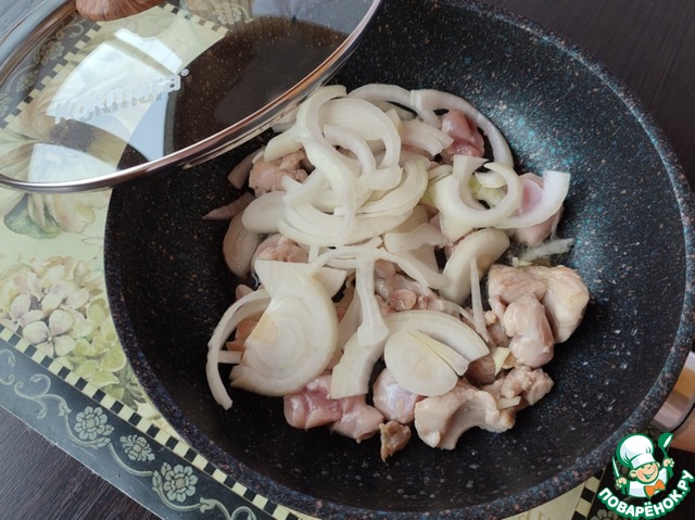 Обжарить курицу, нарезанную на кусочки (у меня филе бёдра и голени) на сильном огне. Буквально пару минут, чтобы подрумянилась.