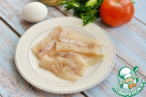 Филе минтая посолите и поперчите со всех сторон. Ломтики филе должны быть довольно тонкими, чтобы они успели приготовиться.
