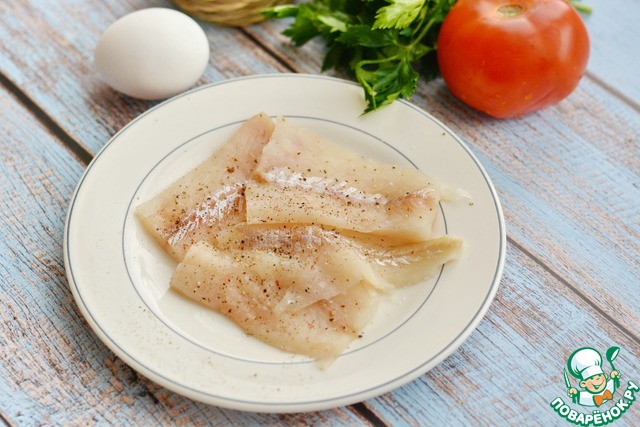 • Филе минтая посолите и поперчите со всех сторон. Ломтики филе должны быть довольно тонкими, чтобы они успели приготовиться.