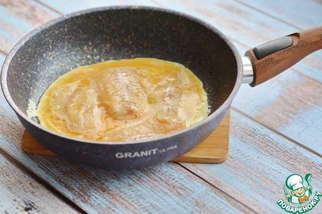 • На сковороде разогрейте немного растительного масла. Аккуратно вылейте яйцо с рыбным филе на сковороду.